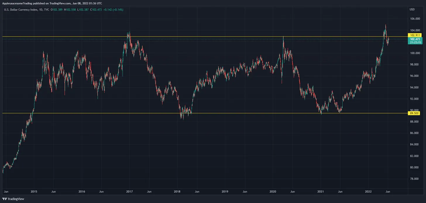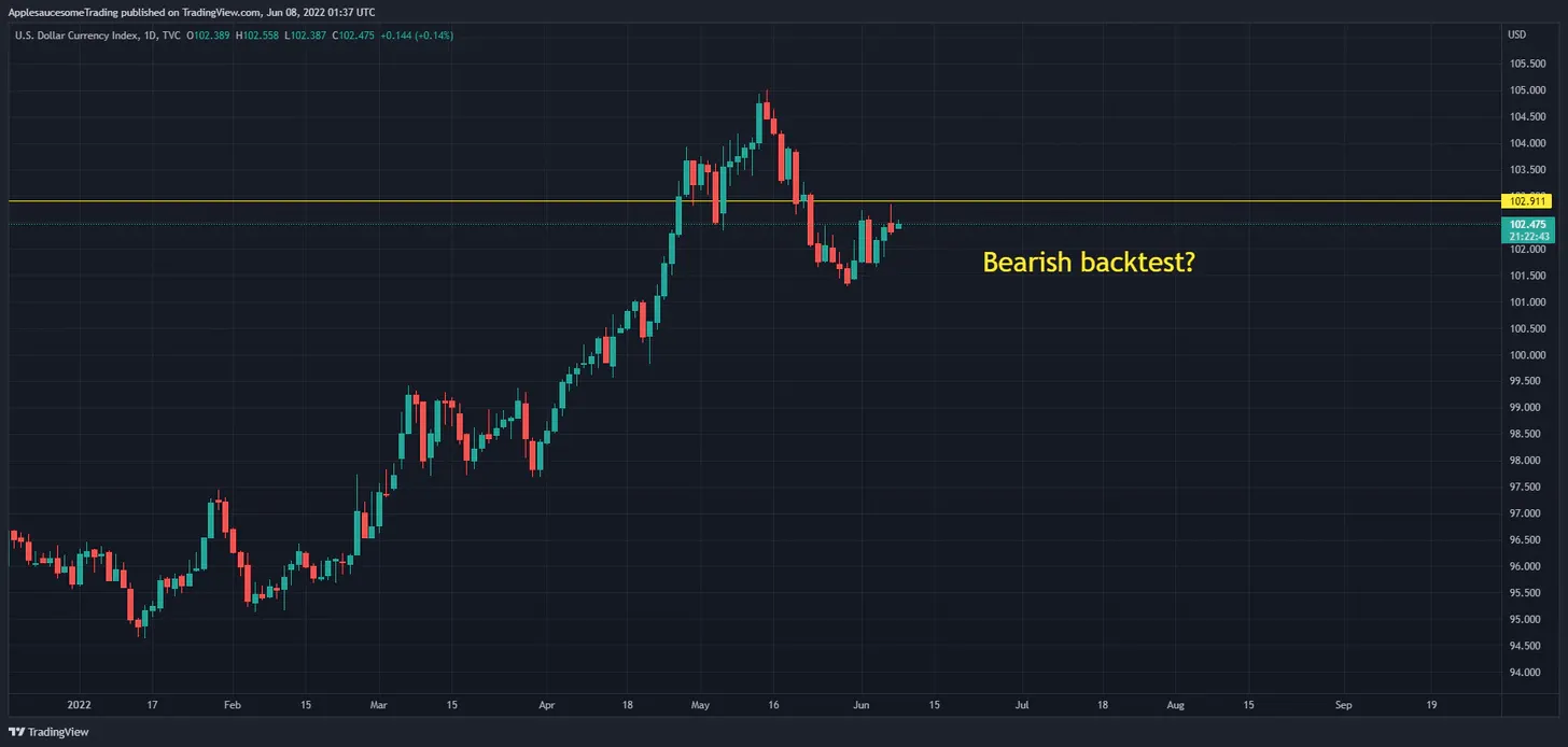 The DYX hasn’t done anything. Zzzz. There’s an argument that could be made that it’s pulled back within the range and is making a bearish backtest though.