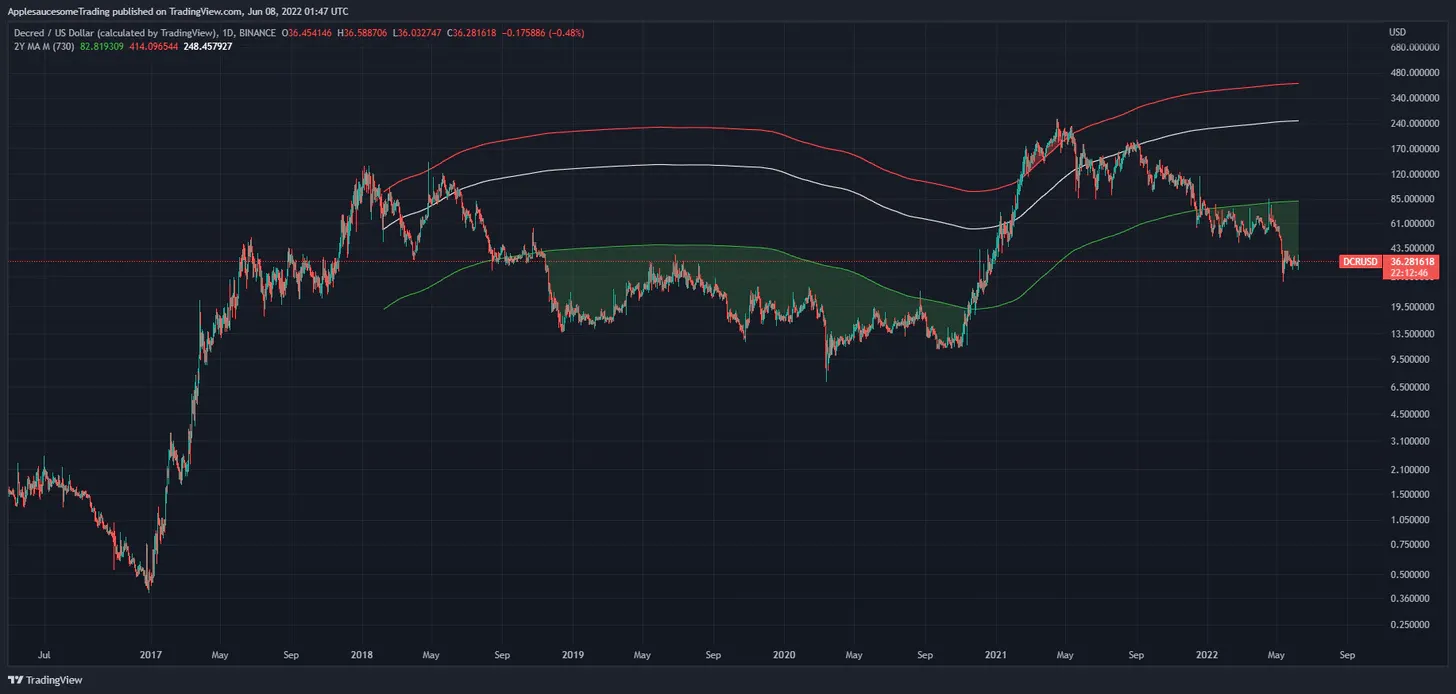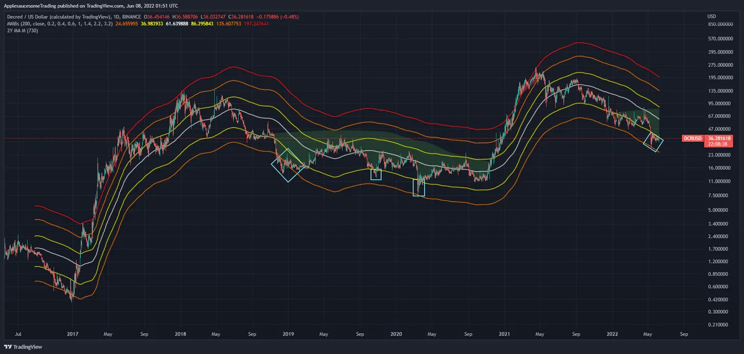 We can see we’re currently at what could be a potential prime area to DCA into, based on the previous bear market.