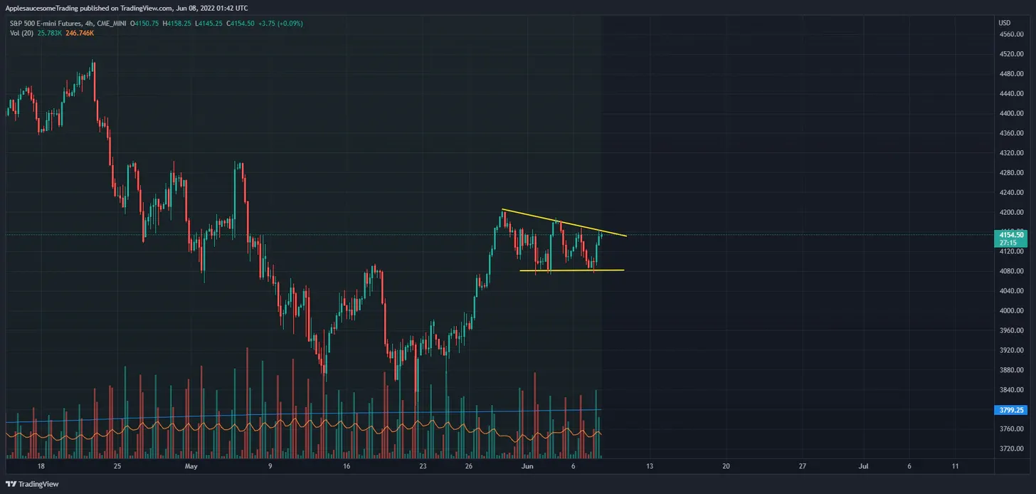 The S&P held the bounce from the anchored VWAP still. There’s really not a whole lot of action but there’s a small glimmer of hope. After the bounce back up a flag formation is being built. If that breaks up it could mean good things for tech stocks and crypto.