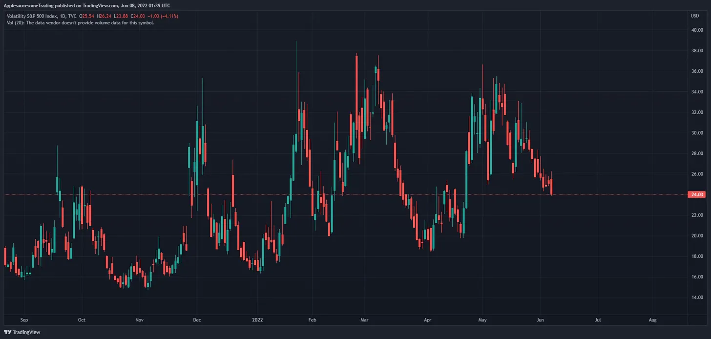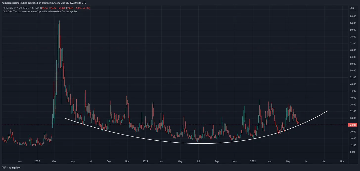 The VIX is oscillating back down which is good. It’s basically a fear/greed index for the S&P. Up is bear, down is bull. Zoomed out though it’s possible that it’s just going to make a higher low though which is no bueno.