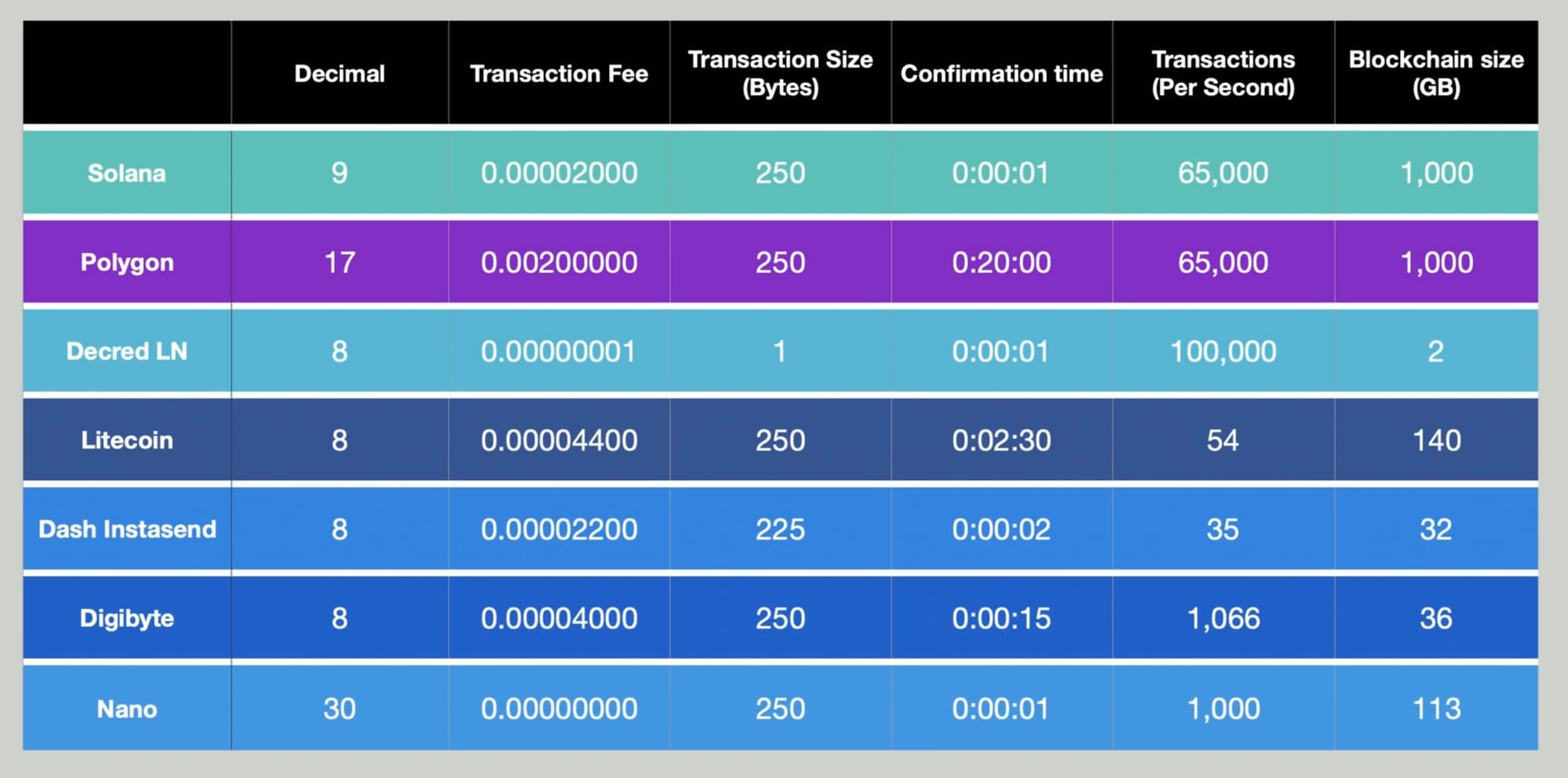 All the platforms listed achieve the ability of sending lots of cheap and fast transactions per second. Which is a much-needed user experience, but these platforms would still get costly if you needed to send thousands of transactions per day. For example, If I send 10,000 transactions on Digibyte the cost would be (4000 × 10,000) 40,000,000 units or 0.4 DGB. Conducting these same transactions on LN would be 10,000 units or 0.00010000 DCR. And on Nano, the fees would be zero.