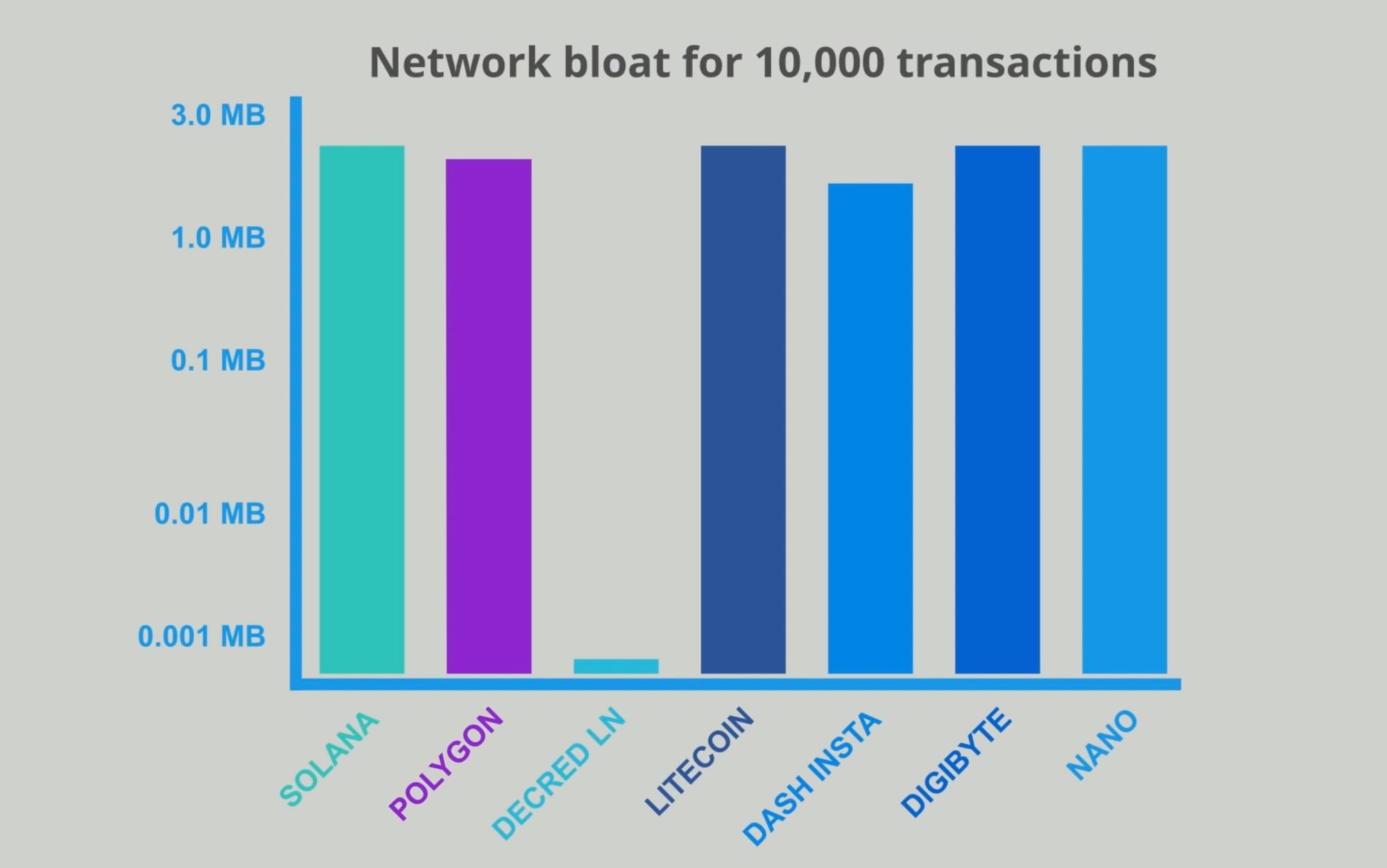 Another factor to consider is the amount of weight these transactions would add to the blockchain. Out of all of these solutions, only one optimises natively to reduce on-chain bloat, and that’s the Lightning Network. All other platforms produce approximately 250 Bytes per transaction, all of which, goes on-chain. Running the same example as above for 10,000 transactions on the Nano platform (10,000 × 250 B = 2.5 million Bytes), this would produce approximately 2.5 MB of on-chain data. On the Lightning Network, this same calculation of 10,000 transactions can be reduced to 2 on-chain transactions of 500 Bytes or 0.0005 MB. This is due to the off-chain nature of the Lightning Network and the need to only synchronise with the blockchain when opening and closing payment channels.