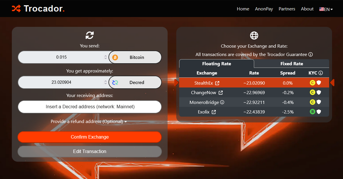 - Trocador.app has been added to Exchanges, it is a meta exchanger that finds quotes from various services and then fronts it for the user via their APIs. It works without JavaScript and over Tor (they even have an Onion URL). A useful feature of Trocador is it rates the probability of each backend provider forcing KYC/AML after the fact. This is the biggest risk with instant exchanges other than outright scamming. Additionally, Trocador may reimburse some of the exchanged amount if for some reason the backend provider fails to send funds or provide some proof of a legal order justifying it. DCR was listed in February 2023.