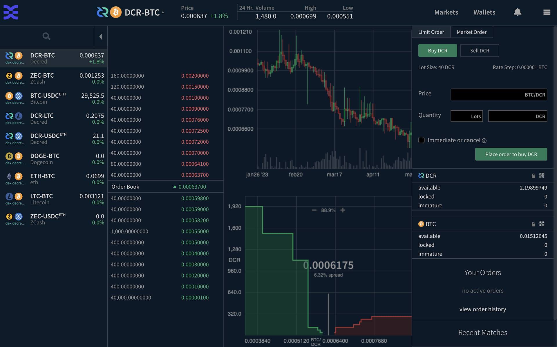 Image: Updated trading view in DCRDEX v0.6.0