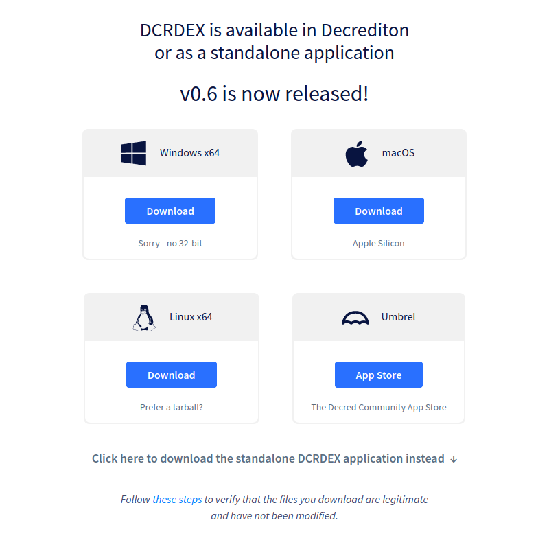 dexcapp from core software release (more CPU and OS options, signed byDecred Releasekey) - Standalone