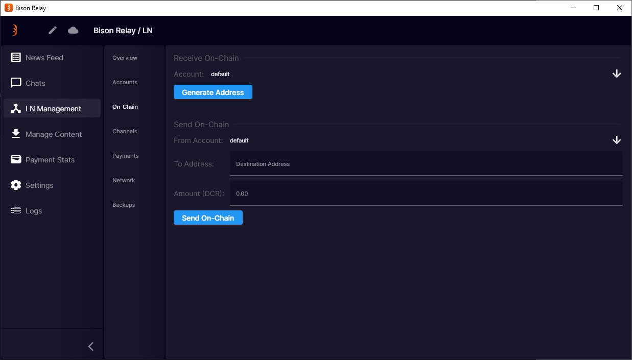- Send and receive DCR on-chain (can be used to withdraw DCR from Bison Relay)