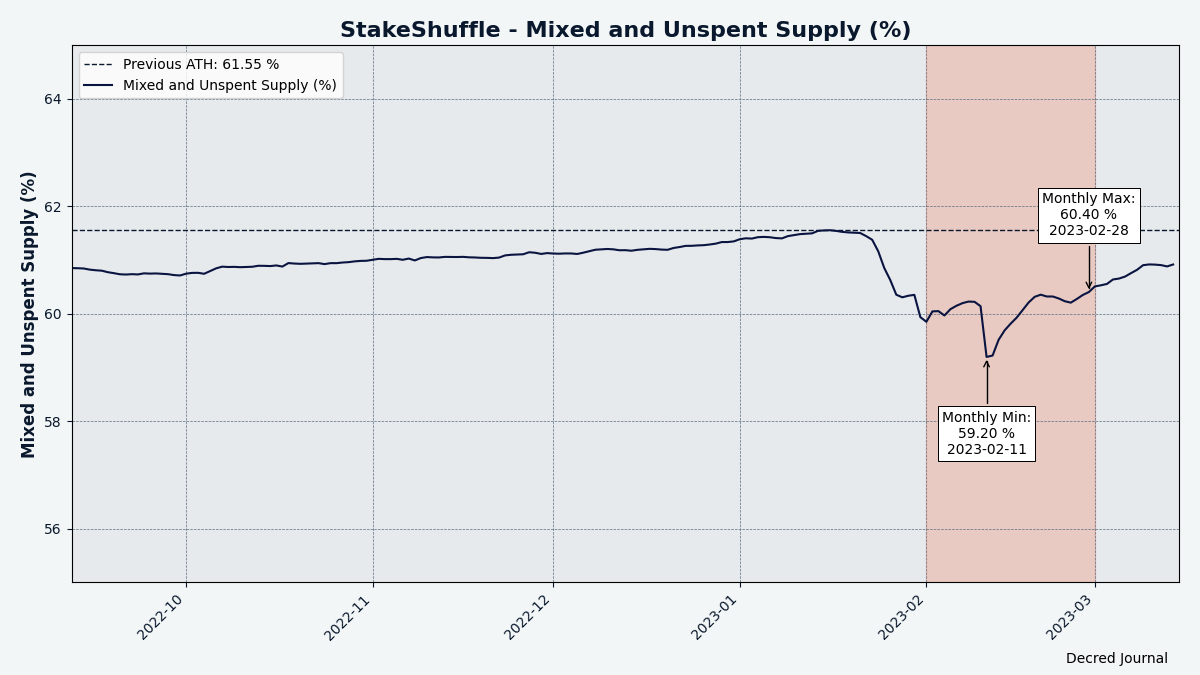 The share of mixed coins varied between 59.2-60.4%. Daily mixed volume varied between 206-865K DCR.