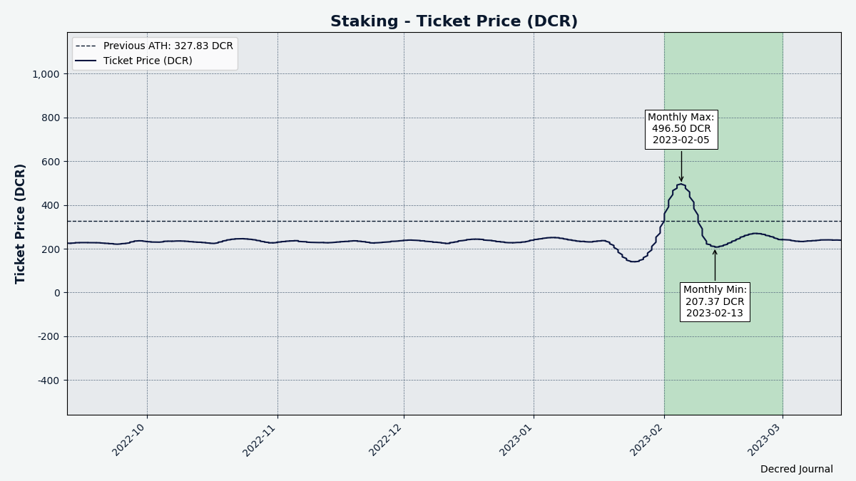 Staking: Ticket price varied between 207-496.5 DCR, with 30-day average at 263.8 DCR (+51.3).