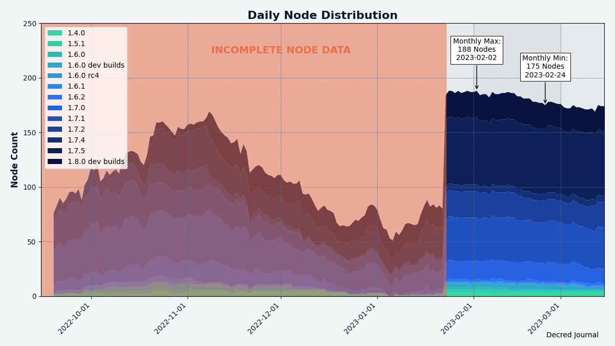 Nodes: Decred Mapper observed between 175 and 188 dcrd nodes throughout the month. Versions of 176 nodes seen on Mar 1: v1.7.5 - 34%, v1.7.2 - 22%, v1.8.0 dev builds - 13%, v1.7.2 - 11%, v1.7.0 - 10%, v1.7.4 - 3%, other - 7%.