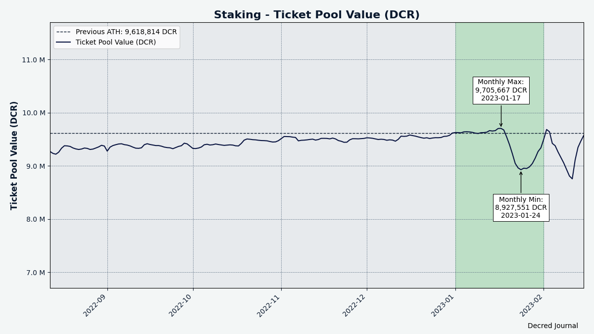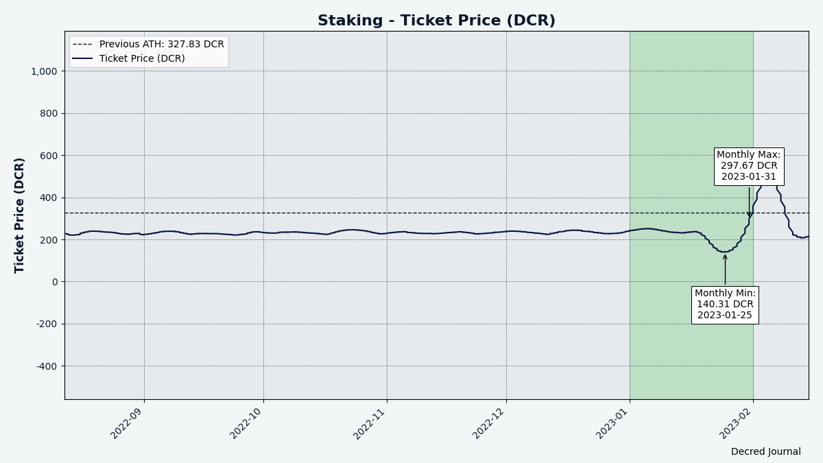 In January DCR was trading between USDT $18.30-$24.90 and BTC 0.00097-0.00116. The average daily rate was $22.05.