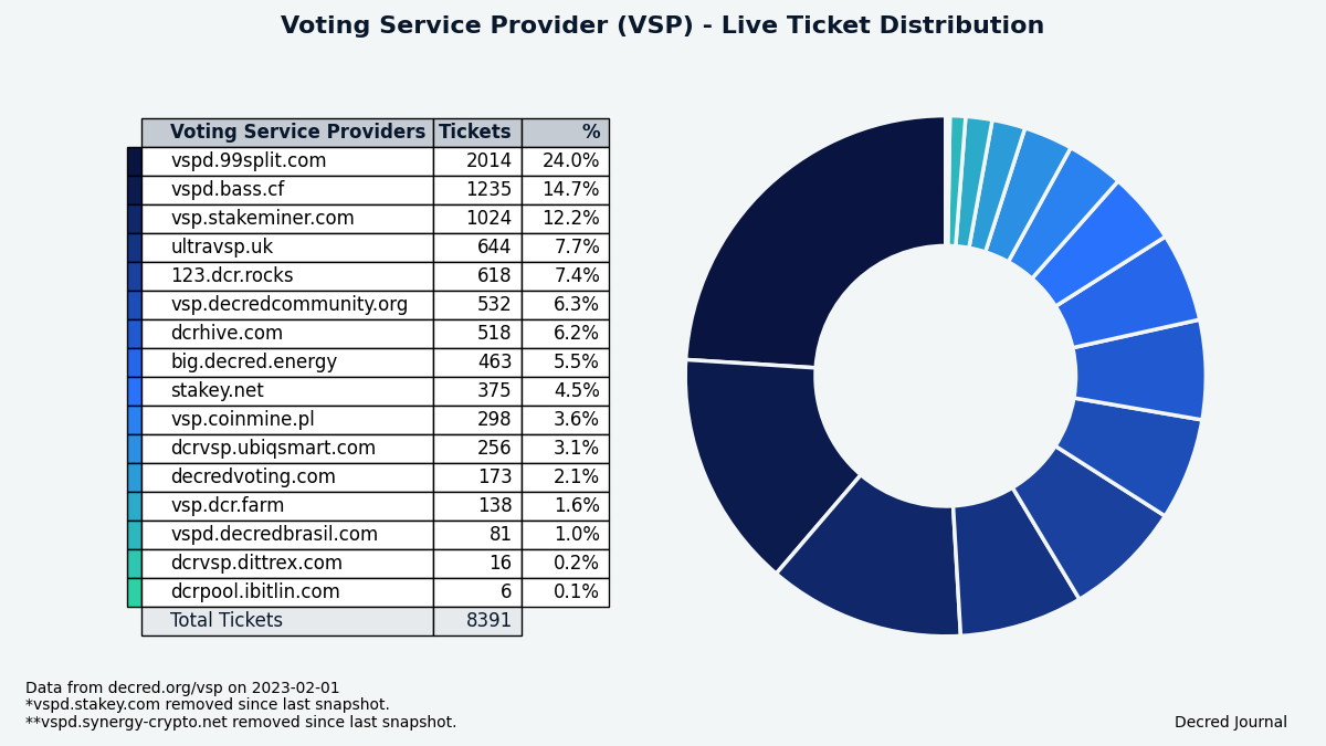 VSP list API now reports block height and estimated network proportion. Block height provides more certainty about the VSP being stalled or fully synced with the blockchain. Historical snapshots of API data are available here.