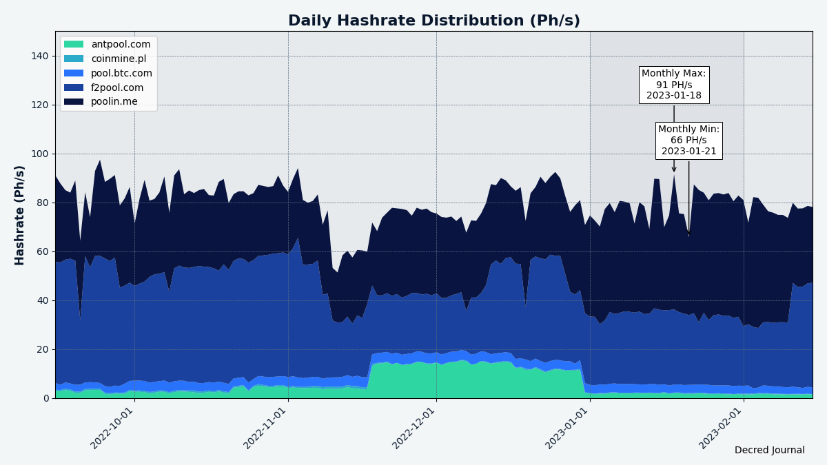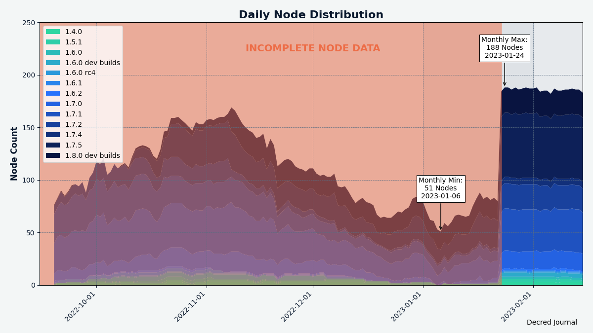 Decred's Lightning Network explorer has seen 147 nodes (+17), 261 channels (+28) with a total capacity of 106.1 DCR (+5.4), as of Feb 1. These stats vary depending on the LN node. For example, @karamble's node reported 163 nodes (+19), 347 channels (+35) and 159.7 DCR (+5.7) capacity on same Feb 1.