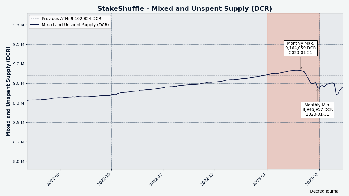 The share of mixed coins varied between 59.9-61.6%. Daily mixed amount varied between 140-611K DCR.