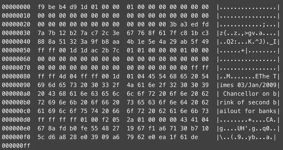 A reference to a headline from The Times newspaper about a failed attempt by the British government to stimulate the economy. This has been interpreted both as a date-setting for the first block and as a criticism of the prevailing banking system. The crypto market has taken those criticisms of the current financial system as inspiration.