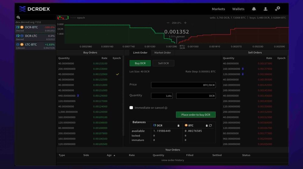Decred decentralized exchange DCRDEX is one of the project's greatest features. It has no arbitrary fees, letting only users profit from their transactions, trading coins like Bitcoin, Ethereum, USDC, Litecoin, Digibyte, and Doge.
