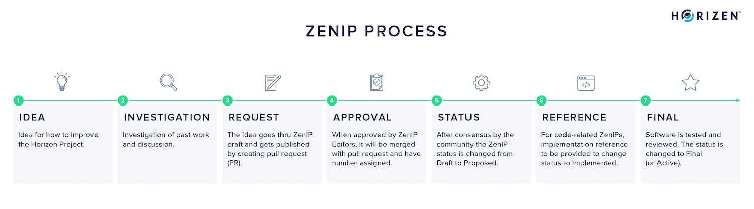 Each ZenIPs starts with an owner proposing by specifying it and creating a pull request on the ZenIP repository. ZenIP editors are responsible to help owners review and merge the pull request if all requirements are met. After the public discussion, Editors need a supermajority to approve the proposal. After the test phases, A ZenIP becomes activated on the Horizen blockchain if it meets the project's quality standards.