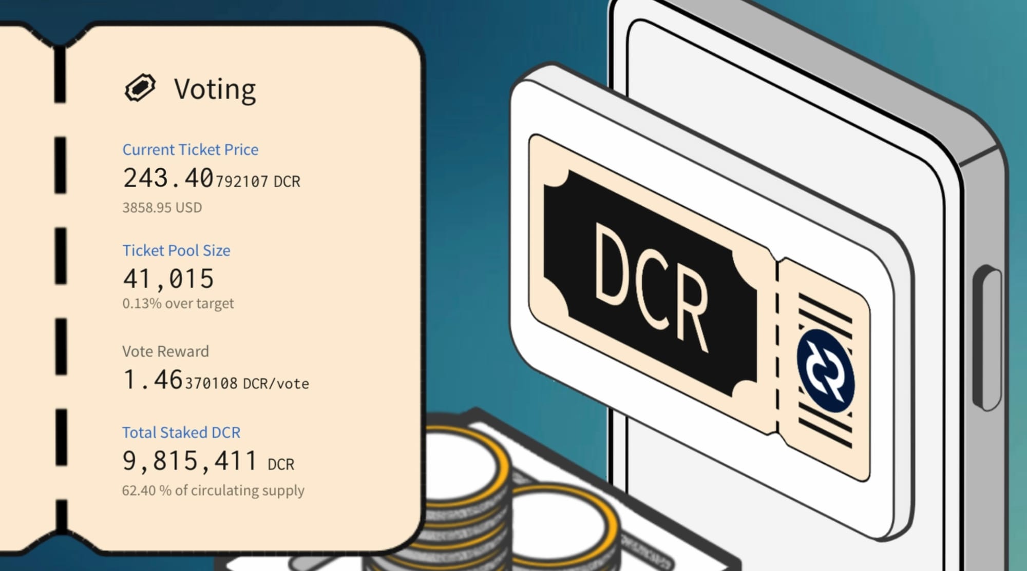 At the time of writing, the dcr ticket price is 243 dcr. And the total dcr staked is 9.8 million dcr, which is 63% of the current supply.